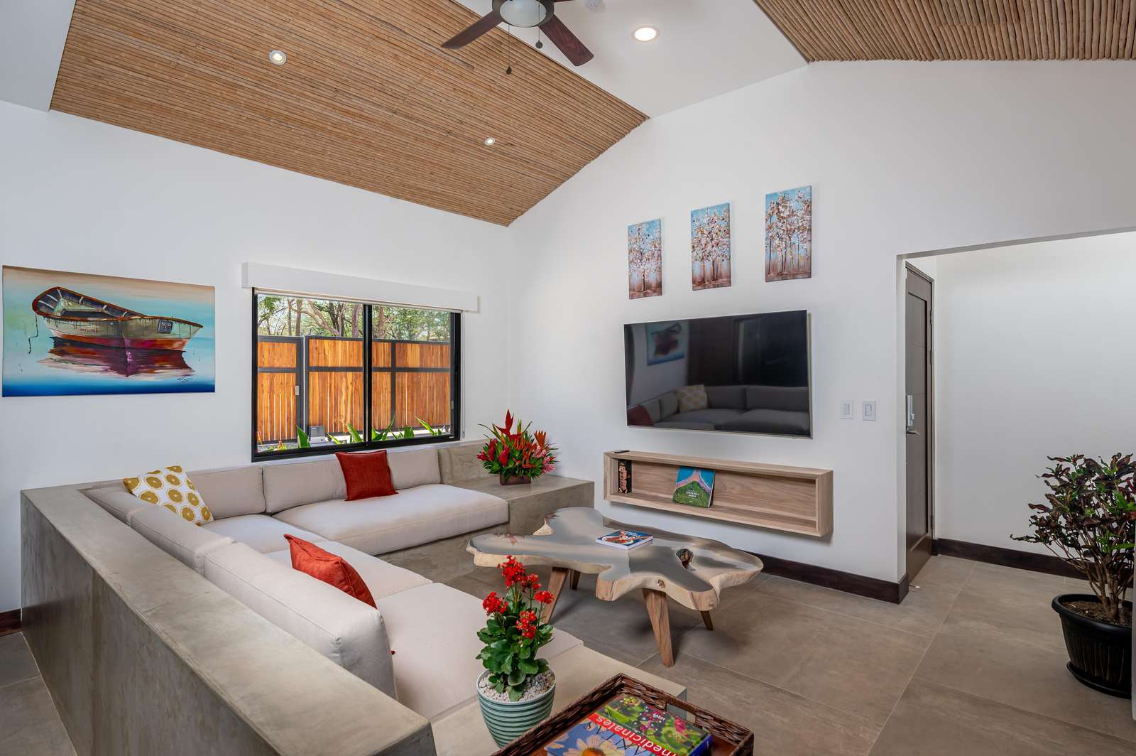 One of the first things you'll appreciate about Casa Prema is its solid concrete construction, which gives the home a sense of quality, durability, and peace of mind. Inside, the living room feels open and inviting with its stunning vaulted ceilings, creating an airy central space that instantly makes the home feel bright, spacious, and welcoming. It is the kind of room that naturally brings everyone together, whether for quiet mornings, casual afternoons, or evenings spent entertaining family and friends.