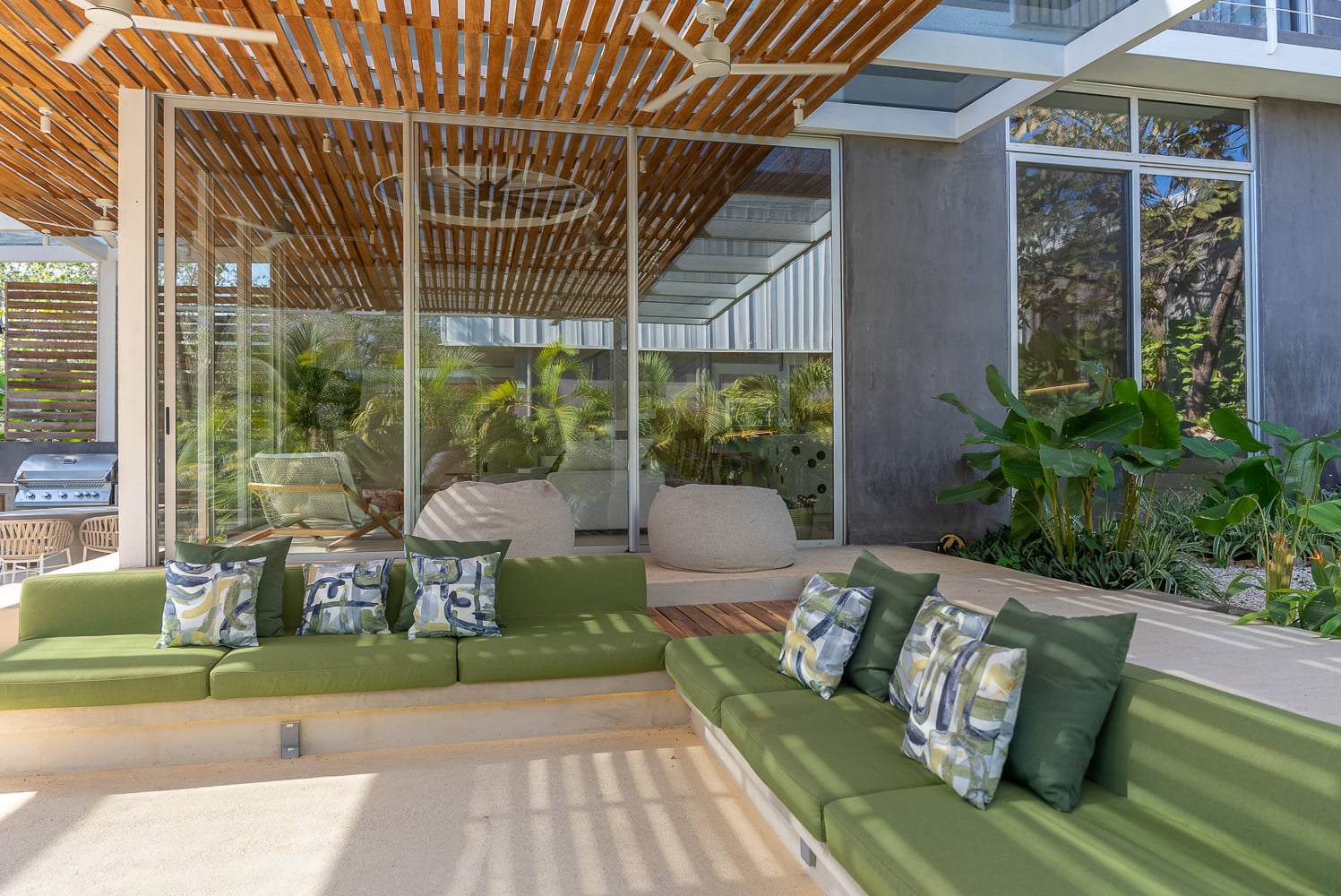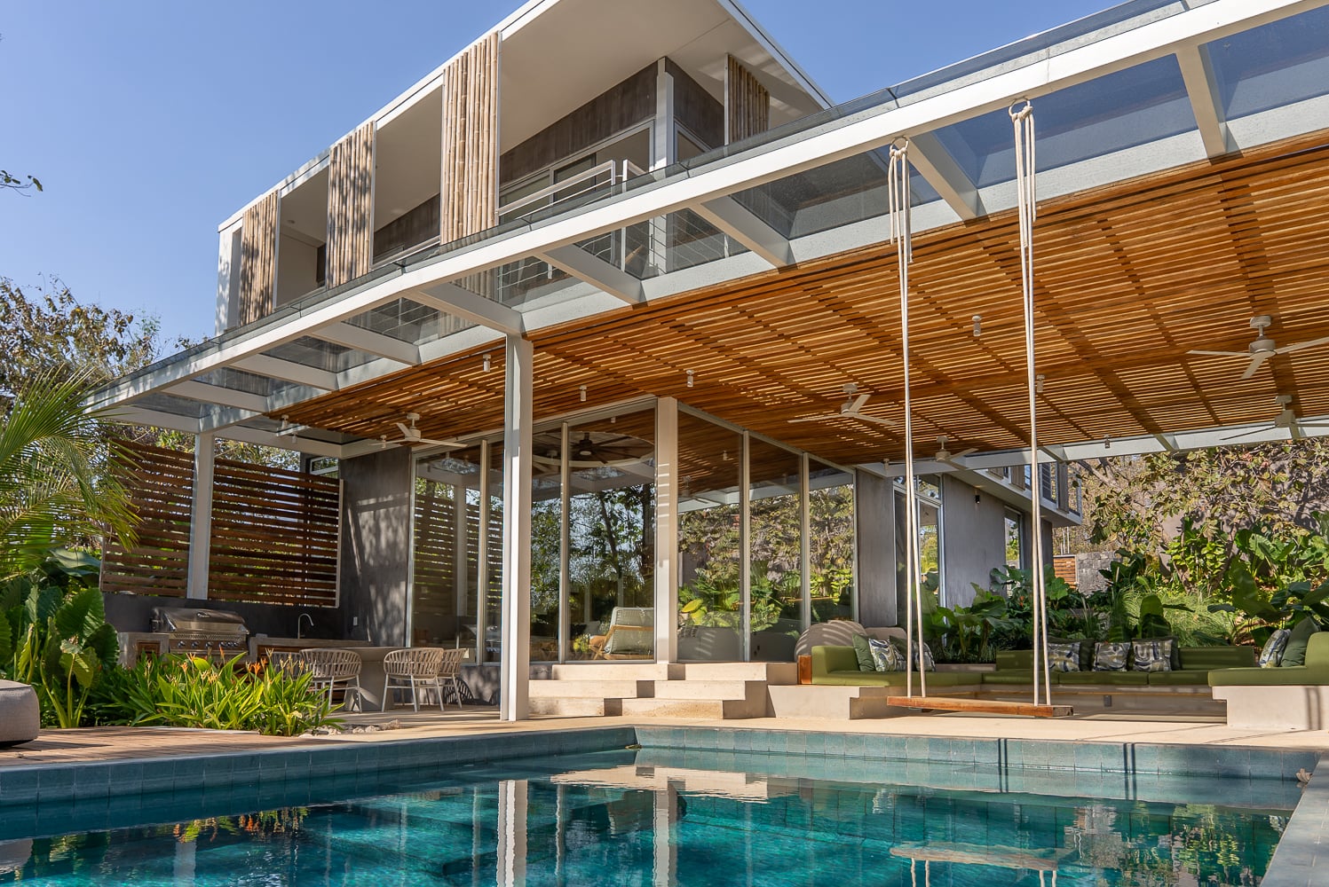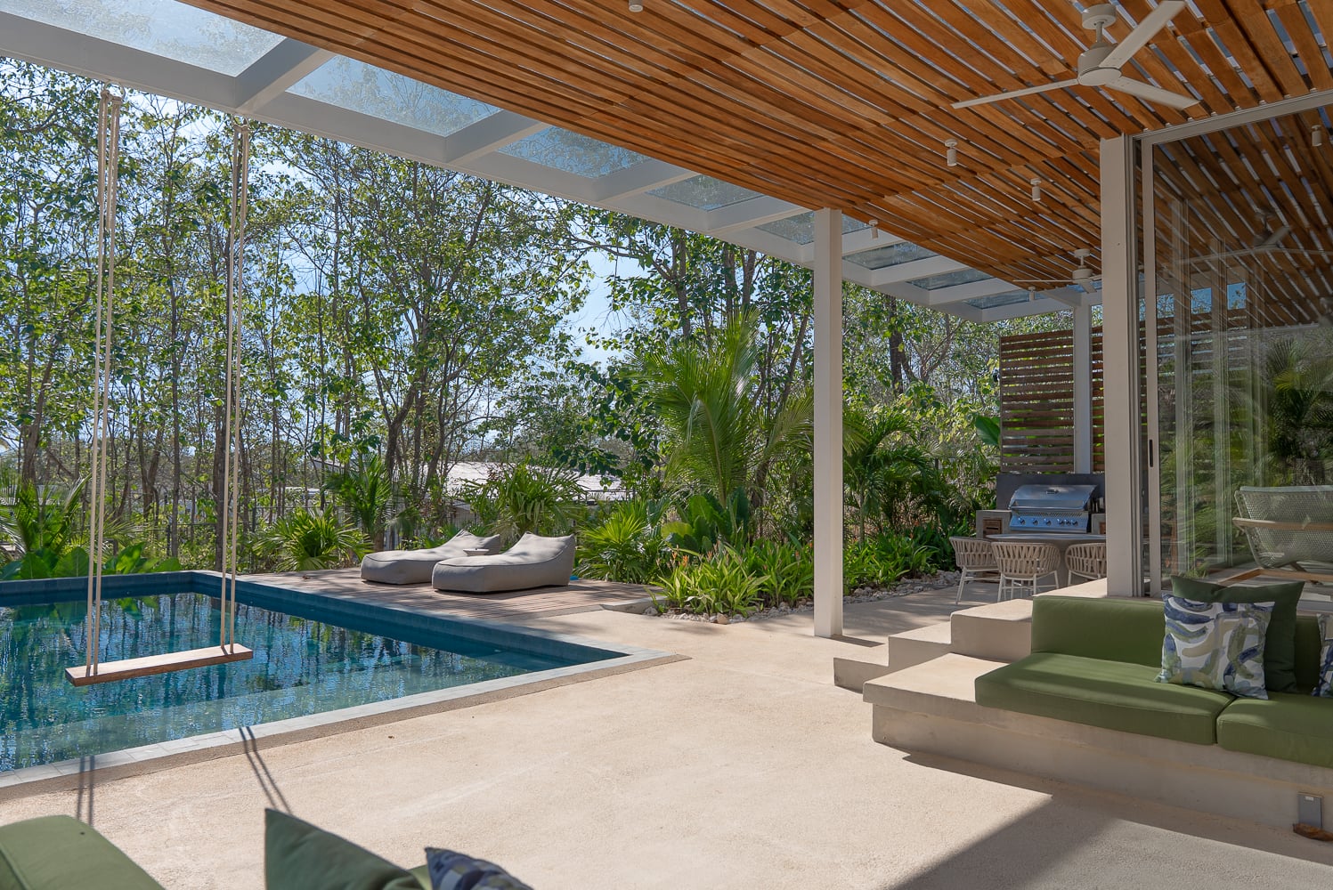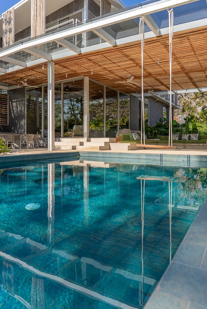 The entry to the home brings you in through a walkway with peeks at the gardens and surrounding trees. Arriving in the great room, you appreciate the large island between the kitchen and living area. But drawing your attention the most is the defining feature of the home: the outdoor terrace and pool area. A generous 3-sided couch area looks over the almost oversized pool. There is both a shaded and an open patio for lounge chairs and relaxing.